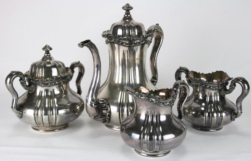 Meriden Brittania Company. Plated. Unter dem Boden gestempelt. Größe der Kanne ca. 22,5 x 15,5 cm, Höhe ca. 23,5. Gesamtgewicht ca. 1.886 Gramm.