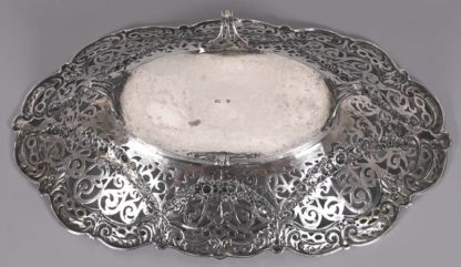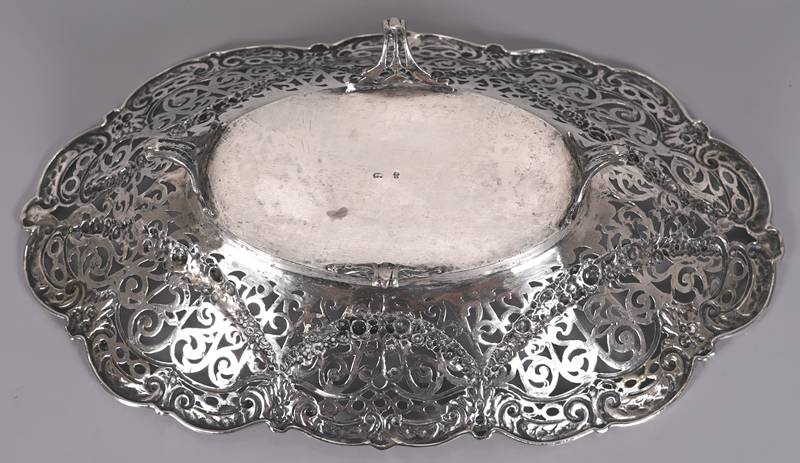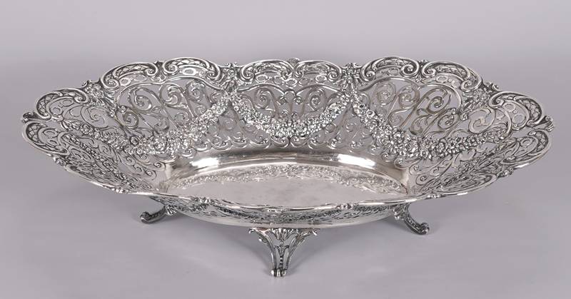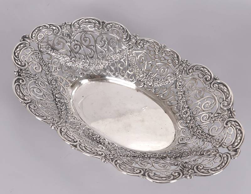 Korbrandschale Um 1900. Silber (geprüft). Ovale Schale auf vier Füßen mit durchbrochen gearbeiteter Wandung mit Girlandendekor. Unter dem Boden mit zwei verschlagenen Punzen. Größe ca. 34 x 21 cm, Höhe ca. 8 cm. Gewicht ca. 490 Gramm. Altersbedingte Patina wie abgebildet.