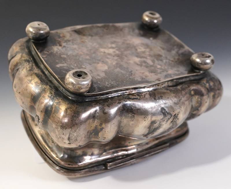 Wohl um 1800. Silber 750. Gedrückter, ausladender Korpus auf vier Kugelfüßen. Klappdeckel mit Schloss. Unter dem Boden punziert E 750. Größe ca. 16 x 12,5 cm, Höhe ca. 10 cm. Gewicht ca. 277 Gramm. Kein Schlüssel vorhanden. Teils bestoßen. Mit altersbedingter Patina.