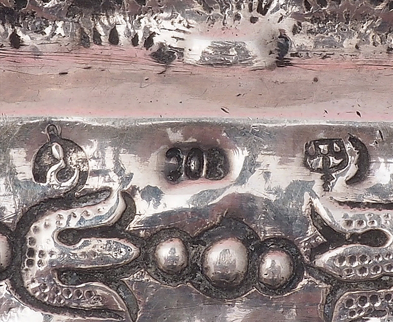 Barock, Schweden um 1770. Silber mit diversen Punzen und späteren deutschen Garantiemarken Silber 800, Halbmond und Krone. Flachgemuldeter Korpus mit Rocaillengriffen und nordisch mythologischer Szene mit dem Drachen Nidhöggr im Spiegel in schönem Relief. Größe ca. 13 x 8 cm, Gewicht ca. 61 Gramm. Schöne Patina.