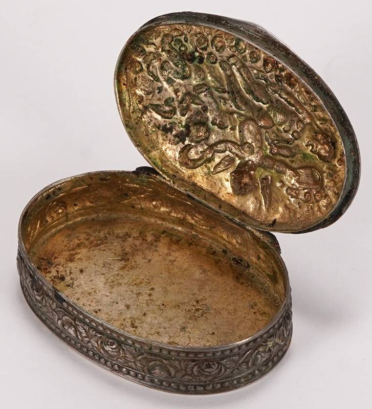 Kleine Dose 19. Jh. Silber 800. Kleine, ovale Dose mit reliefierter Wandung. Auf dem Deckel Szene mit Putti. Am Deckel punziert. Größe ca. 6 x 4 cm, Höhe ca. 1,5 cm. Gewicht ca. 43,7 Gramm. Altersbedingte Patina.