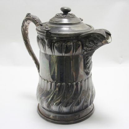 USA 19. Jh. Versilbert. Einmal Reed and Barton, einmal Mariden Britannia Company. Zwei Deckelkannen mit opulentern Verzierungen an der Wandung und Porzellan- Innenverkleidung. Jeweils unter dem Boden Hersteller- und Patentpunzen. Größe ca. 27 x 17,5 cm, Höhe ca. 32 cm. Gewicht ca. 5,8 kg. Ein Deckel ist abgebrochen.