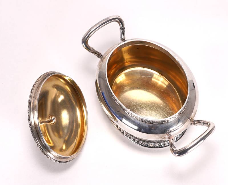 Deckeldose Freiburg 19. Jh. Silber 800. Hofjuwelier Friedrich Lodholz. Bauchige Deckeldose mit glatter Wandung und Zapfen auf dem Deckel. Dekorbänder auf dem Fuß und am Hals. Seitlich zwei Handhaben. Innen ausvergoldet. Unter dem Boden Feingehaltsmarke, Halbmond und Krone sowie Herstellermarke. Größe ca. 17 x 10 cm Höhe ca. 11,5 cm. Gewicht ca. 420 Gramm.