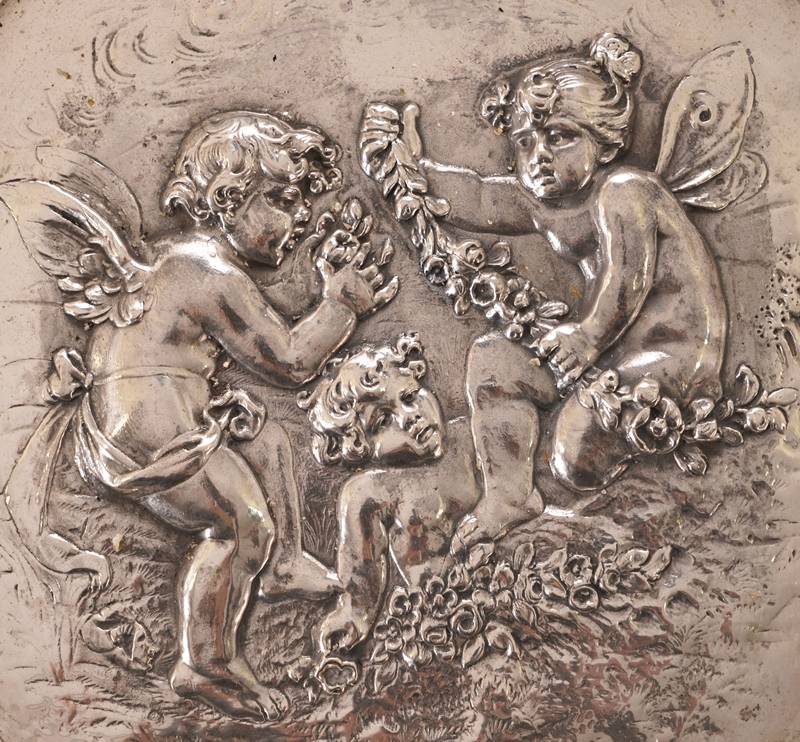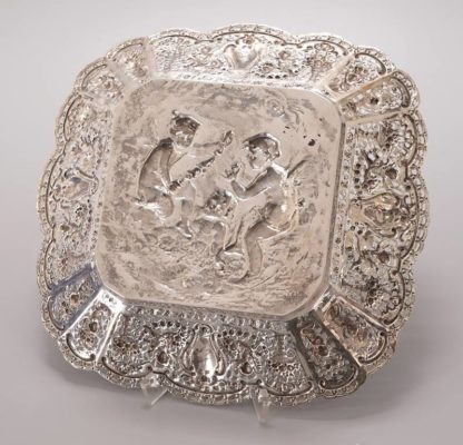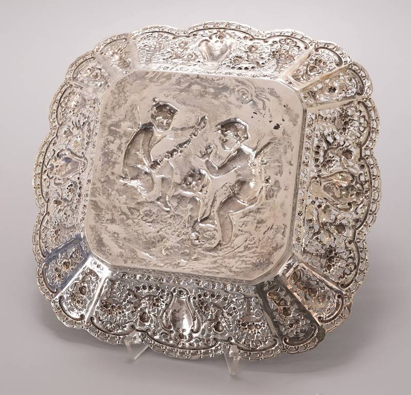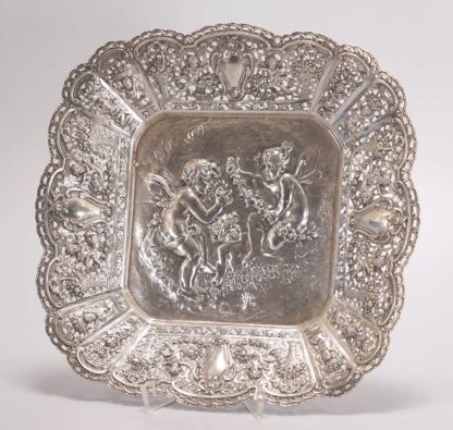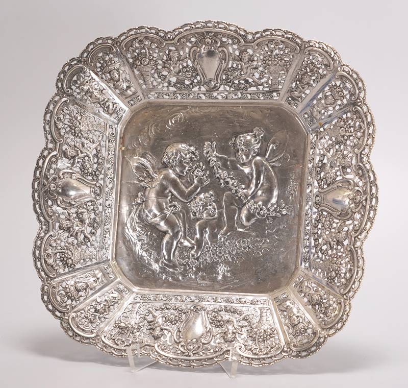 Christoph Wiedmann Pforzheim frühes 20. Jh. Silber 800. Quadratische Schale mit geschweiften, durchbrochen gearbeiteter Fahne mit Putten- und Blumendekor. Im Fonds reliefierte Szene mit drei Putten und Girlanden. Im Fonds punziert mit Feingehalt und Herstellerpunze. Größe ca. 24 x 24 cm, Höhe ca. 3,5 cm. Gewicht ca. 380 Gramm.