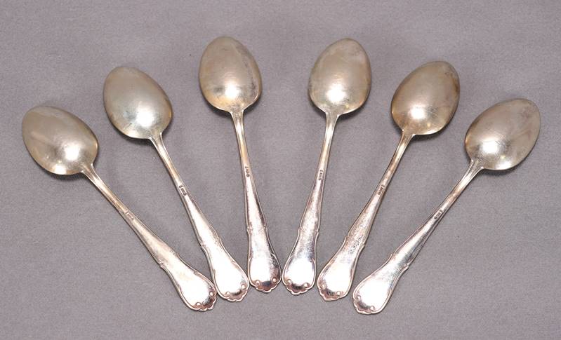 Sechs Dessertlöffel Deutsch. Silber 800. Sechs kleine Löffel. Jeweils punziert mit Halbmond und Krone, Feingehalt sowie Herstellermarke (verschlagen). Länge ca. 14,3 cm. Gesamtgewicht ca. 150 Gramm.