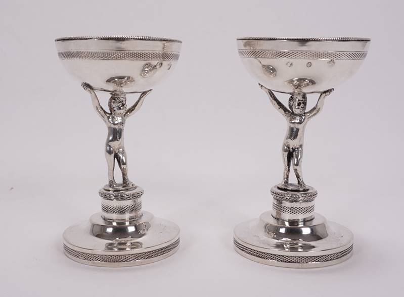 Paar Salieren Österreich 19. Jh. Silber 800. Feine, rund gearbeitete Form mit figurativem Schaft. Punziert mit A 13 Lot und Herstellermarke. Größe je ca. 6,5 x 6,5 cm, Höhe ca. 11 cm. Gewicht zusammen ca. 267 Gramm.