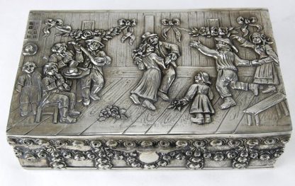 Deutsch um 1900. Relief auf dem Deckel zeigt Musik und Tanz in einem Wirtshaus. Innen auf dem Rand punziert 800, Halbmond, Krone. Größe ca. 17 x 11 cm, Höhe ca. 5 cm. Gewicht ca. 540 Gramm.