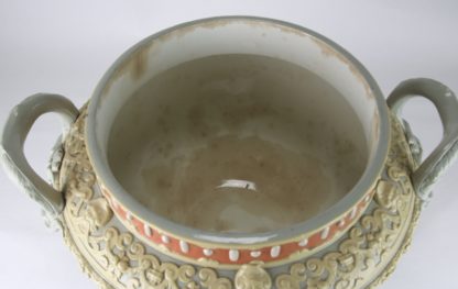 Um 1900. Glasiertes Steinzeug. Bowle mit zwei Griffen und Deckel auf Teller. Friesartiges Figurenrelief. Auf dem Deckel findet man Städtenamen, aber auf dem Teller Sprüche zum Thema Wein. Unter dem Boden gemarkt. Größe des Topfes ca. 29,5 x 34,5 cm, Höhe ca. 29 cm. Durchmesser des Tellers ca. 41 cm, Gesamthöhe ca. 31,5 cm. Gewicht ca. 9,5 kg. Griff des Deckels fehlt, ansonsten guter Zustand. Siehe auch Kirsners The Mettlach Book Nummer 2087.