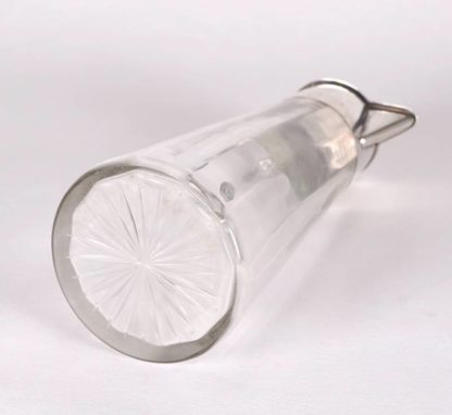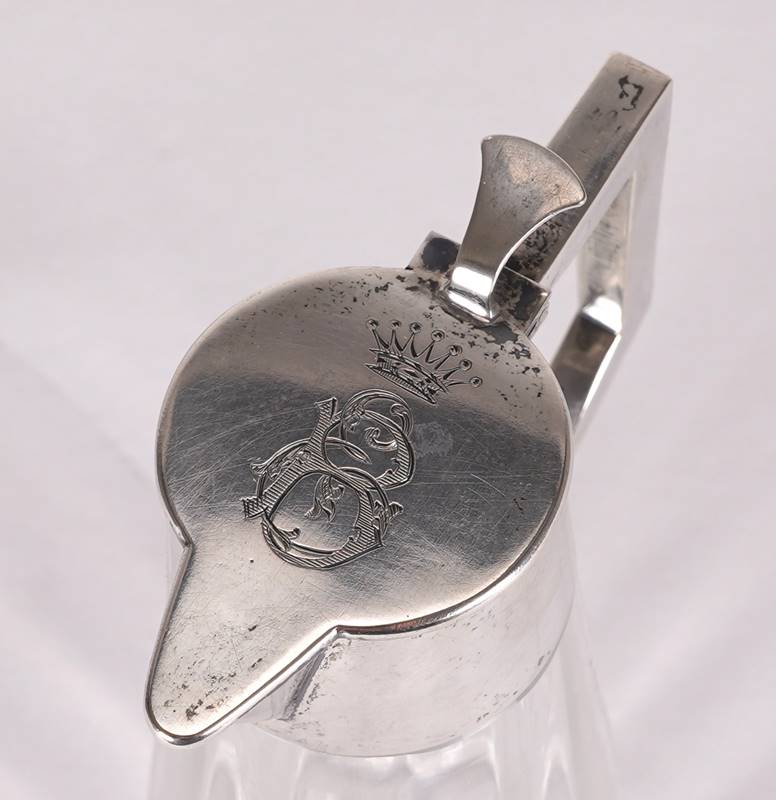 Glaskanne Österreich um 1900. Glas und Silber 800. Zylindrischer Korpus mit innen facettierter Wandung. Griff und Öffnung aus Silber. Monogrammgravur auf Deckel. Neben dem Ausguss Dianakopfpunze. Durchmesser ca. 7 cm, Höhe ca. 18 cm. Gewicht ca. 325 Gramm.