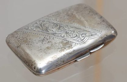 Zigaretten Etui Chester um 1900. Silber 925. Glatte Wandung mit einem floralen Band. Innen punziert mit Feingehaltspunze, Stadtmarke, Jahresbuchstabe und verschlagener Meisterpunze wohl E J Trevitt & Sons. Größe ca. 7,5 x 5 cm, Höhe ca. 1,5 cm. Gewicht ca. 39,1 Gramm. Altersbedingte Patina, teils best.