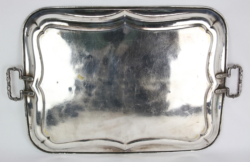 Russland 1889. Versilbert. Rechteckige Platte mit jeweils einer Handhabe an der kurzen Seite und leicht gemuldetem Fond. Auf der Platte punziert, zweimal Doppelkopfadler mit kyrillischer Schrift sowie datiert. Größe ca. 35 x 54 cm. Gewicht ca. 1,46 kg. Teils berieben.