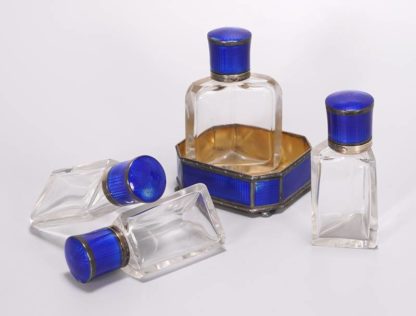 Parfumflakon Set Wohl Birmingham 20. Jh. Silber 925 und Glas. Vier dreieckige Flakons auf einem achteckigen Tablett. Deckel und Wandung des Tabletts guillochiert und blau emailliert. Im Tablett und am Hals der Flakons punziert mit Feingehalt 925, Herstellermarke C&C (wohl Cohen & Charles), Jahresbuchstabe (?) h und weiterer, unbekannter Punze. Gesamtgröße ca. 7 x 6 cm, Höhe ca. 8,5 cm. Teils bestoßen, teils mit Patina.
