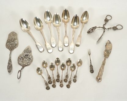 Russland 1880. Silber 875. Dazu ein ähnlicher Löffel und ein Fischmesser, ebenfalls Russland 1827, Silber 875. Gewicht ca. 353,44 Gramm. Dazu acht kleine Löffelchen, eine Tortenheber und eine Zange mit Hildesheimer Rose, Silber 835, 155,8 Gramm, und ein Tortenheber mit einem kleinen Spieß, Silber 800, 54,16 Gramm. Jeweils gepunzt.