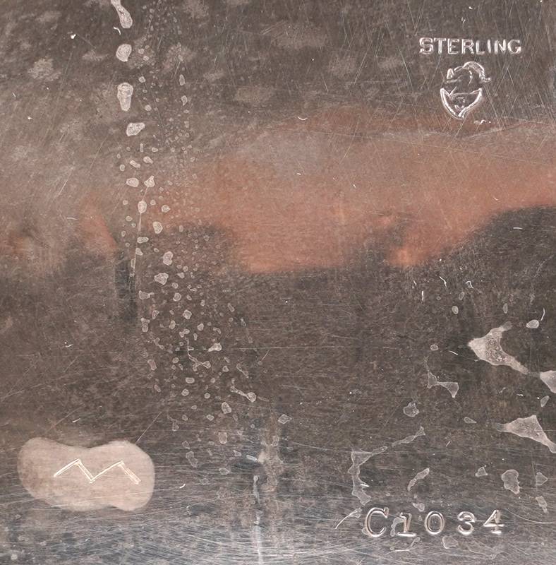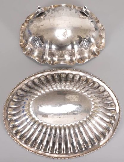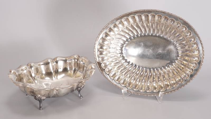 Eine ovale Schale auf vier Füßen, punziert Silber 800, Luigi di Calegaro Padua. Größe ca. 16 x 12,5 cm, Höhe ca. 6 cm. Gewicht ca. 120 Gramm. Eine ovale Schale unter dem Boden bezeichnet "Sterling" sowie ungedeutete Punze und Nummer, geprüft. Größe ca. 20,5 x 16 cm, Höhe ca. 3,5 cm. Gewicht ca. 130 Gramm. Altersbedingte Patina wie abgebildet.