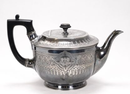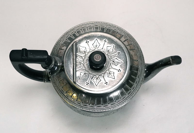 Sheffield 1889. James Dixon & Sons. Electro Plated Britannia Metal. Umlaufendes Efeufries mit zwei Medaillons, einmal mit Initialen und einmal mit Datum. Ebenholzgriff. Unter dem Boden Hersteller- und Legierungspunzen. Größe ca. 24 x 14 cm, Höhe ca. 15 cm.