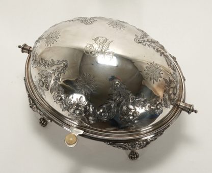 England, Elkington um 1860. Versilberung elektroplated. Servierbehälter für Butter etc. mit Drehdeckel und zwei Einsätzen z.B. auch für Kaviar oder Meeresfrüchte geeignet. Auf vier Löwenfüßen, großer Behälter mit floraler Ornamentik. Unten punziert mit Herstellermarken und Nummer 17424. Größe ca. 32 x 22 cm, Höhe ca. 22 cm, Gewicht ca. 2,5 Kilogramm. Guter Zustand. Vergleiche ein ähnliches Stück im Lon Museum London aus dem Jahr 1877.