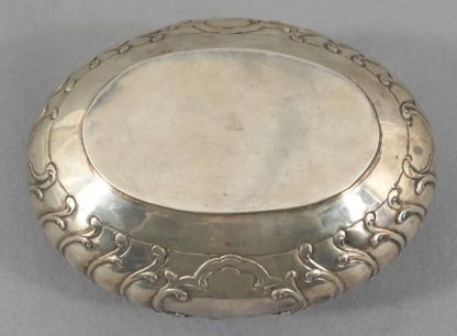 Zuckerdose Silber 800. Ovale Dose mit bauchiger Wandung und reliefiertem Dekor. Innen ausvergoldet. Unter dem Boden mit Feingehaltspunze 800 und verschlagener Meisterpunze. Größe ca. 15 x 11 cm, Höhe ca. 8 cm, Gewicht ca. 310 Gramm.