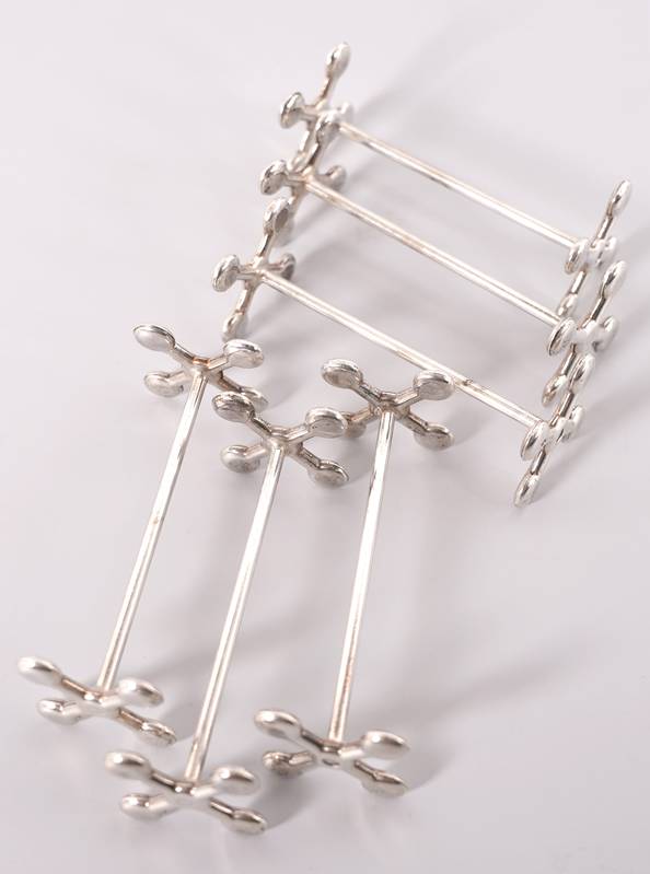 Rino Greggio Padua 20. Jh. Silber 800. Sechs Bänkchen auf einfachem Kreuz. Je punziert mit Feingehalt, Städtemarke sowie Herstellernummer. Länge je ca. 7,5 cm, Gesamtgewicht ca. 140 Gramm. Zustand wie abgebildet.