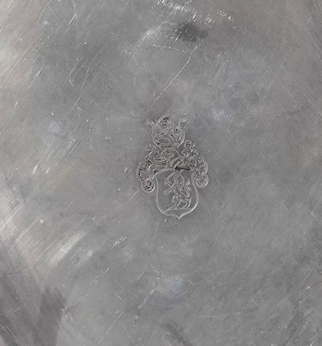 Deutsch, um 1900. Wilhelm Theodor Binder. Silber 800. Rundes Tablett mit Wappen in der Spiegelmitte, der Rand ist mit einem reliefierten Kranzdekor geschmückt. Unter dem Boden punziert mit Halbmond und Krone, Herstellermarke WTB sowie einer Nummerierung 61965. Durchmesser ca. 21 cm, Gewicht ca. 198 Gramm.