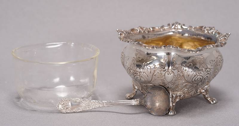 Sucrier Howard & Co. Providence, Rhode Island USA. Sterling Versilberung. Barockform mit originalem Kunststoffeinsatz und passendem Löffel. Größe ca. 9 x 8 cm, Höhe ca. 5,5 cm. Altersbedingter Zustand mit Patina wie abgebildet.