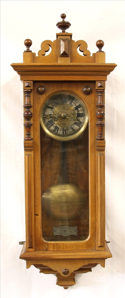 Wohl Schwarzwald 19. Jh. Dreiseitenverglastes Holzgehäuse mit Metallzifferblatt und Scheibenpendel. Halbstundenschlag auf Tonfeder. Größe ca. 27 x 15 cm, Höhe ca. 86 cm. Altersbedingter Zustand, läuft an und schlägt.