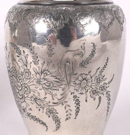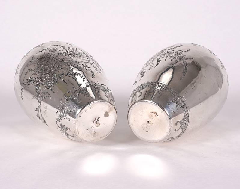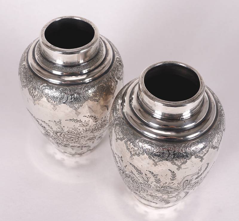 Paar Vasen Iran, Teheran 20. Jh. Silber (geprüft). Bauchiger Korpus mit eingezogenem Stand und Öffnung. Florale Gravur. Unter dem Boden jeweils punziert. Durchmesser je ca. 8 cm, Höhe je ca. 15 cm. Gesamtgewicht ca. 519 Gramm. Teils eingedellt.