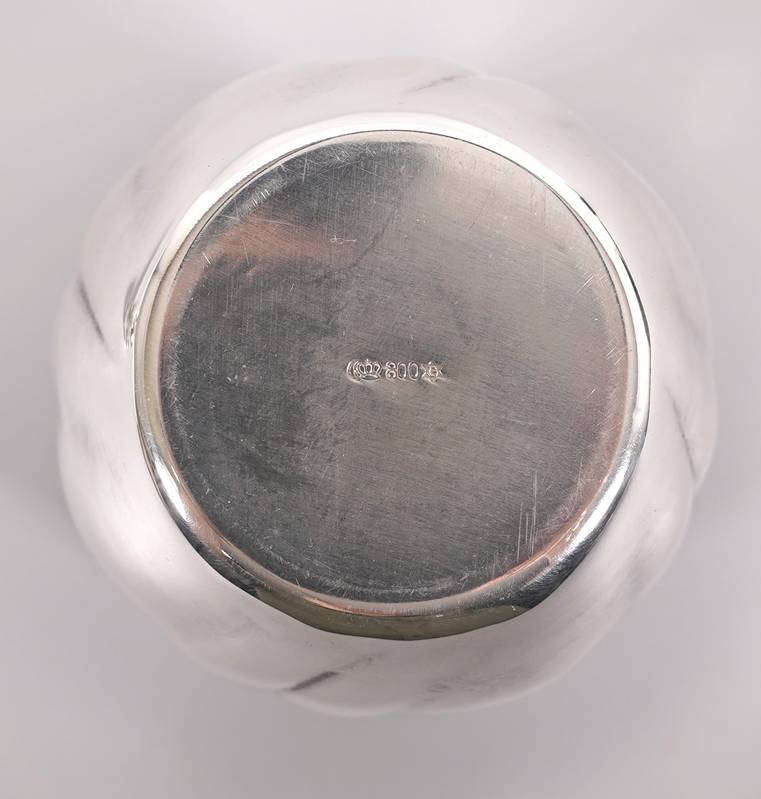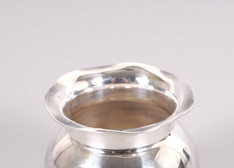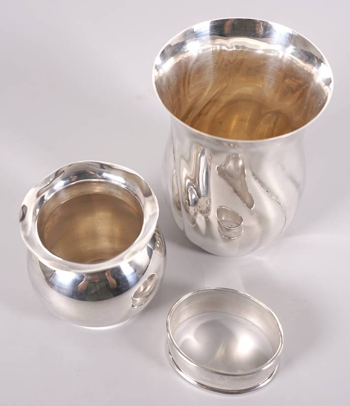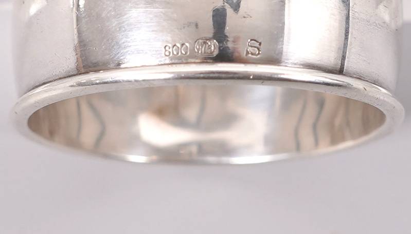 Jacob Grimmiger Schwäbisch Gmünd, 20. Jh. Silber 800/925. Eine kleine bauchige Vase und eine höhere, gedrehte Vase. Je unter dem Boden punziert mit Halbmond, Krone, Feingehalt und Herstellerpunze. Dabei ein Serviettenring, Wilhelm Binder Schwäbisch Gmünd, Silber 800, punziert. Durchmesser der größeren Vase ca. 7,5 cm, Höhe ca. 10,5 cm. Gesamtgewicht ca. 200 Gramm. Zustand wie abgebildet.