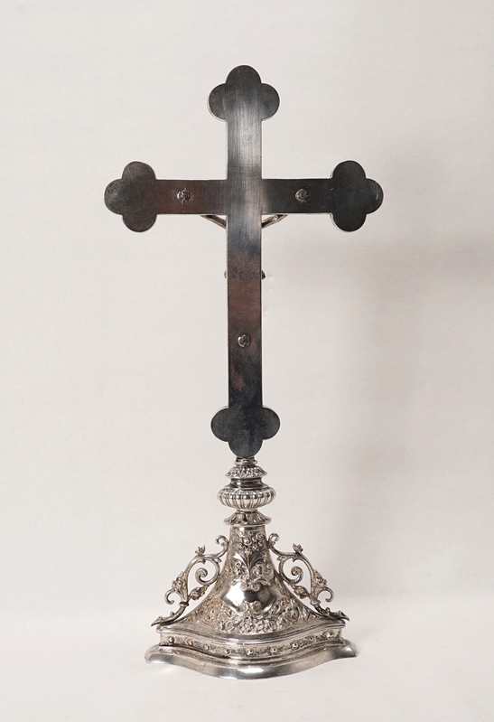 Kruzifix Um 1900. Versilbert. Altarkreuz mit dreipassigen Abschlüssen und vollplastisch gearbeitetem Corpus Christi auf reliefiertem Fuß. Größe ca. 19,5 x 10 cm, Höhe ca. 42 cm, Gewicht ca. 1,1 kg.