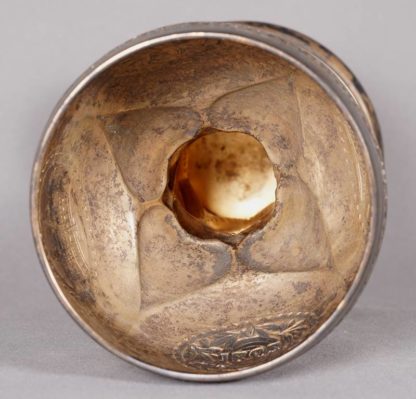 Schützenpokal Frankfurt 1912. Silber 800, vergoldet. Pokal auf rundem Fuß mit Wappen und Zielscheiben auf dem Schaft und Stadtansichten sowie Jubiläumsdaten auf der Wandung der Schale. Oben bezeichnet 17. Deutsches-Bundes-und- Goldenes-Jubiläums-Schiessen-Frankfurt A/M 1912. Unter dem Boden punziert mit Halbmond, Krone, Feingehalt und verschlagener Herstellerpunze. Durchmesser ca. 11 cm, Höhe ca. 24 cm, Gewicht ca. 270 Gramm. Altersbedingte Patina.