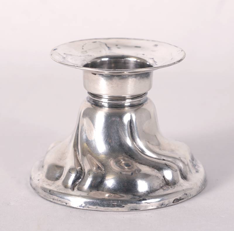 Kerzenleuchter Silber Deutsch. Silber 835. Punziert mit Halbmond, Krone, Feingehalt sowie Herstellermarke. Fuß ist gefüllt und lose. Boden nicht geschlossen. Durchmesser ca. 9 cm, Höhe ca. 7 cm. Gesamtgewicht ca. 258 Gramm.