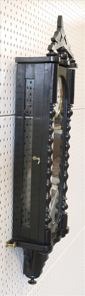 Wohl Schwarzwald 19. Jh. Dreiseitenverglastes ebonisiertes Holzgehäuse mit Emaillezifferblatt und Scheibenpendel. Größe ca. 18,5 x 8,5 cm, Höhe ca. 55 cm. Altersbedingter Zustand, Fehlteile, Beschädigungen, nicht geprüft.