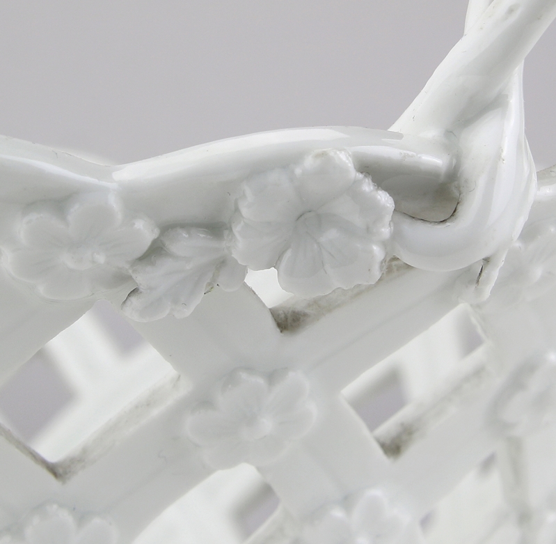 Meissen 18. Jh. Weissporzellan mit Blütenapplikationen und Asthenkel. Unter dem Boden Schwertermarke mit Punkt zwischen den Knäufen. Durchmesser ca. 22 cm, Höhe ca. 10 cm.
