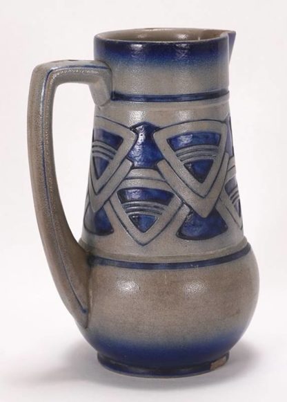Mauder, Bruno für Simon Peter Gerz, Höhr Westerwald um 1907. Steinzeug, graue Salzglasur, blau bemalt. Unter dem Boden Manufakturmarken und Formnummer 1927 D. Höhe ca. 20 cm. Zustand wie abgebildet, Abschlag am Stand.