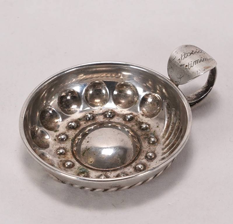 Sommelier-Schälchen Italien 20 Jh. Silber 800. Weingut Fattoria Artimino. Auf der Daumenrast bezeichnet, darunter punziert. Durchmesser ca. 7 cm, Höhe ca. 2,1 cm, Gewicht ca. 39 Gramm. Schöne Patina.