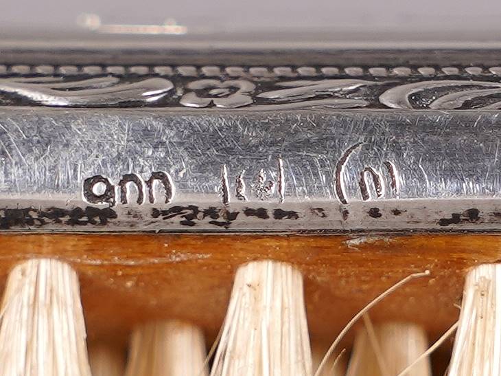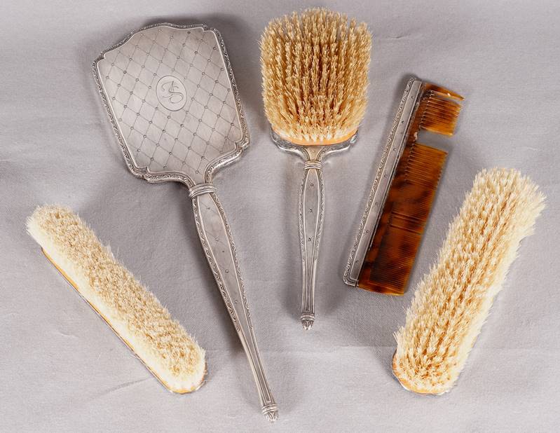 Silber 900. Bestehend aus fünf Teilen. Ein Handspiegel, drei Bürsten und ein Kamm. Jeweils mit Silbermontur, jeweils punziert mit Feingehalt 900 und verschlagener Punze. Mit Sternenmuster im Rapport und umlaufenden Blumenband sowie Monogramm IS. Größe des Handspiegels ca. 36 x 11 cm. Silbermontur des Kamms abgelöst.