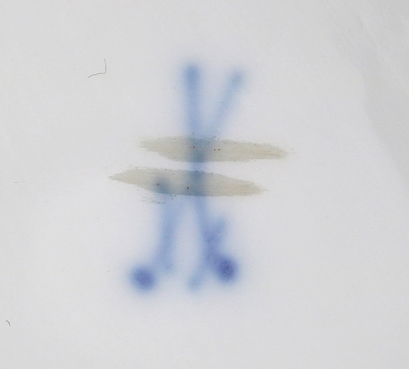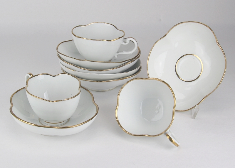 Meissen 18. Jh. Weißporzellan mit Goldrand. Drei Tassen mit sechs Unteren. Unter dem Boden blaue Schwertermarken mit Durchschliffen sowie diverse Malermarken. Durchmesser bis ca. 13 cm. Teils berieben.