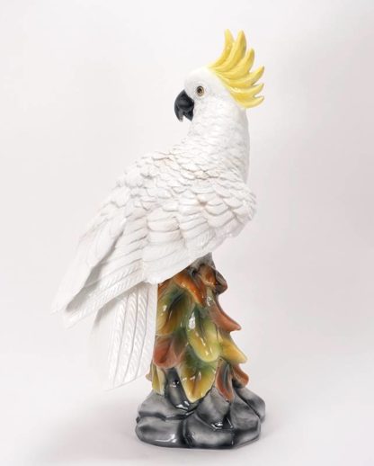 Kakadu Italien 20. Jh. Polychrom gefasst. Naturalistisch gearbeiteter Kakadu auf einer Sitzstange mit Blättern auf einem Felsen. Detailgetreue Ausarbeitung der einzelnen Federn auf dem Rücken. Unter dem Boden bezeichnet Made in Italy. Größe ca. 24 x 28 cm, Höhe ca. 49 cm.