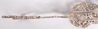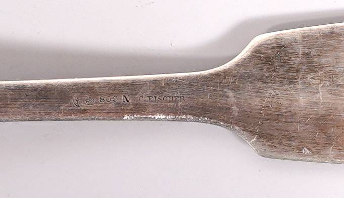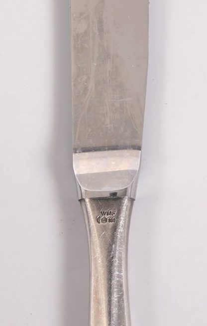 Deutsch Silber 800 (einmal Dänemark). Diverse Löffel eine Kelle, eine Zange und mehrere Spieße. Je punziert mit Feingehalt, meist mit Halbmond und Krone, teils mit Herstellerpunze. Länge der Kelle ca. 35 cm, Gesamtgewicht (ohne Messer) ca. 1009 Gramm. Mit altersbedingter Patina wie abgebildet.