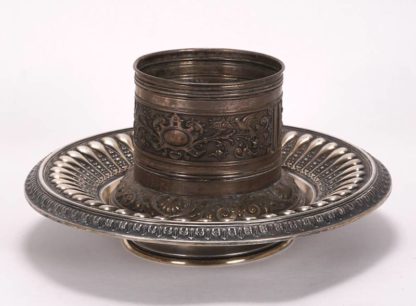 Silberschale Bremen 20. Jh. Koch&Bergfeld. Silber 800. Schale auf rundem Stand mit regelmäßig reliefierter Fahne und reliefiertem Portrait einer Edelfrau im Spiegel. Unter dem Boden Halbmond und Krone, Feingehalt, Herstellerpunze sowie Nummerierung. Durchmesser ca. 24,5 cm, Höhe ca. 6 cm. Gewicht ca. 308 Gramm. Dabei wohl versilberter Flaschenhalter im reliefierter Wandung. Durchmesser ca. 13 cm, Höhe ca. 10 cm. Altersbedingte Patina.