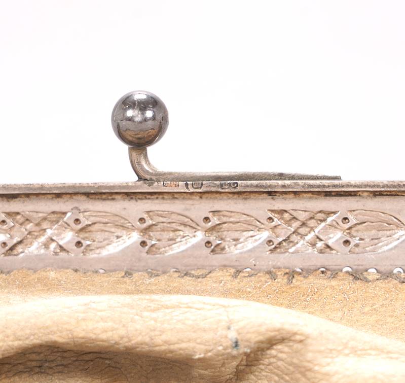 Deutsch frühes 20. Jh. Silber 800. Floral reliefierte Spange mit Kugelverschluss an Kette mit Tasche aus geflochtenem Silberdraht. Innenleben aus weichem Leder. In der Spange punziert mit Halbmond, Krone, Feingehalt und Meistermarke (wohl Bihlmeyer & Co - Schwäbisch Gmünd). Größe ca. 12,5 x 15,5 cm, Gewicht ca. 220 Gramm. Altersbedingte Patina, Gewebe minimal beschädigt.