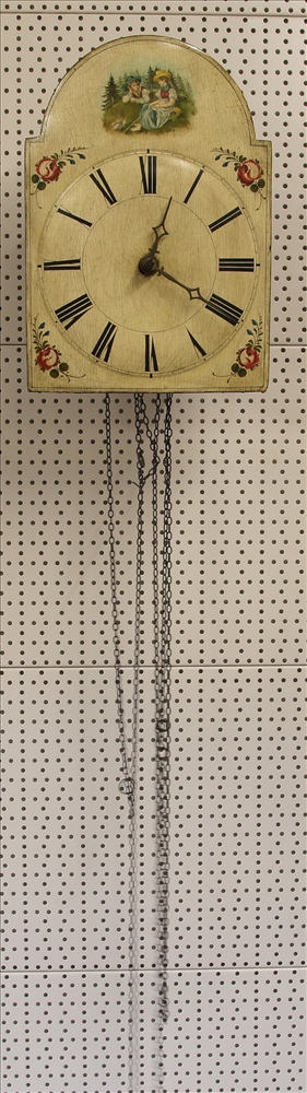 19. Jh. Floral bemaltes Holzschild und holzgespindeltes Messingräderwerk mit Ankergang. Schlag zur halben und vollen Stunde auf Tonfeder. Größe Schild ca. 37,5 x 27 cm. Altersbedingter Zustand, Gewichte und Pendel fehlen, nicht geprüft.