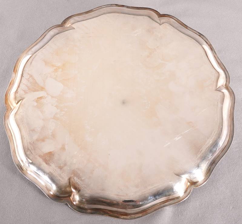 Runde Platte Wilkens Bremen 20 Jh. Silber 835. Geschwungener Rand. Unter dem Boden punziert mit Feingehalt, Halbmond und Krone sowie Herstellerpunze. Durchmesser ca. 29 cm, Gewicht ca. 534 Gramm. Altersbedingte Patina wie abgebildet.