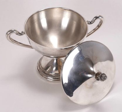 Deckeldose 20. Jh. im Empirestil. Silber 800 punziert und Hersteller. Runder eingezogener Stand mit halbrundem Korpus und seitlichen Handhaben. Innen im Fuß bzw. um Deckelrand punziert. Deckel mit Pinienzapfen. Durchmesser ca. 18 x 11,5 cm, Höhe komplett ca. 15 cm, Gewicht ca. 278 Gramm.