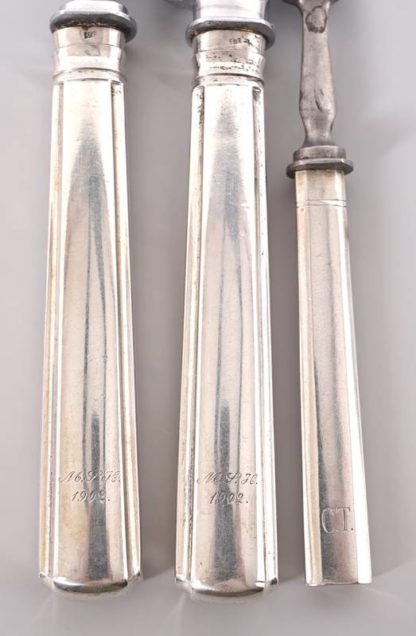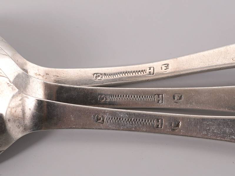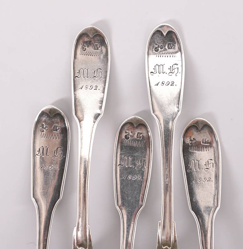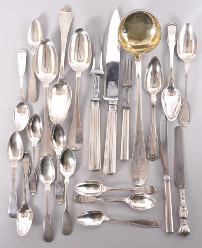 Meist deutsch 19. Jh. Silber meist 12 Lot. Diverse Löffel und verschiedenes Vorlegebesteck. Meist punziert. Gewicht der Kelle ca. 29 cm, Gesamtgewicht (ohne Messer) ca. 580 cm. Zustand wie abgebildet, bitte selbst besichtigen.