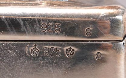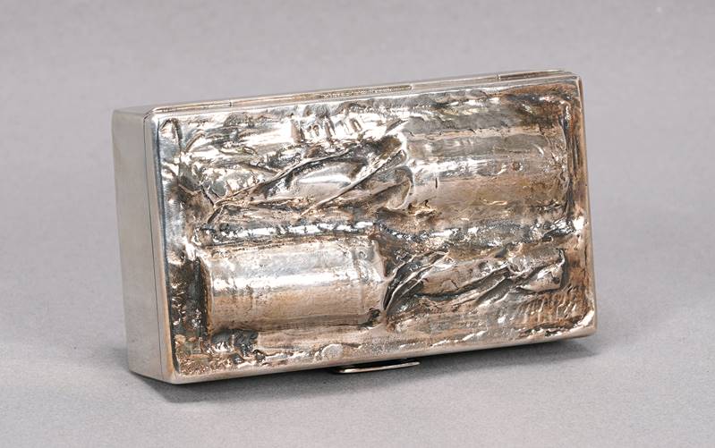 Deutsch 20. Jh. Silber 925. Lutz & Weiß GmbH - Pforzheim. Kleine, rechteckige Dose mit Deckelrelief. Seitlich punziert mit Feingehalt, Halbmond und Krone sowie Herstellerpunze. Größe ca. 11,5 x 6,5 cm, Höhe ca. 4,5 cm. Gewicht ca. 374 Gramm. Altersbedingte Patina.