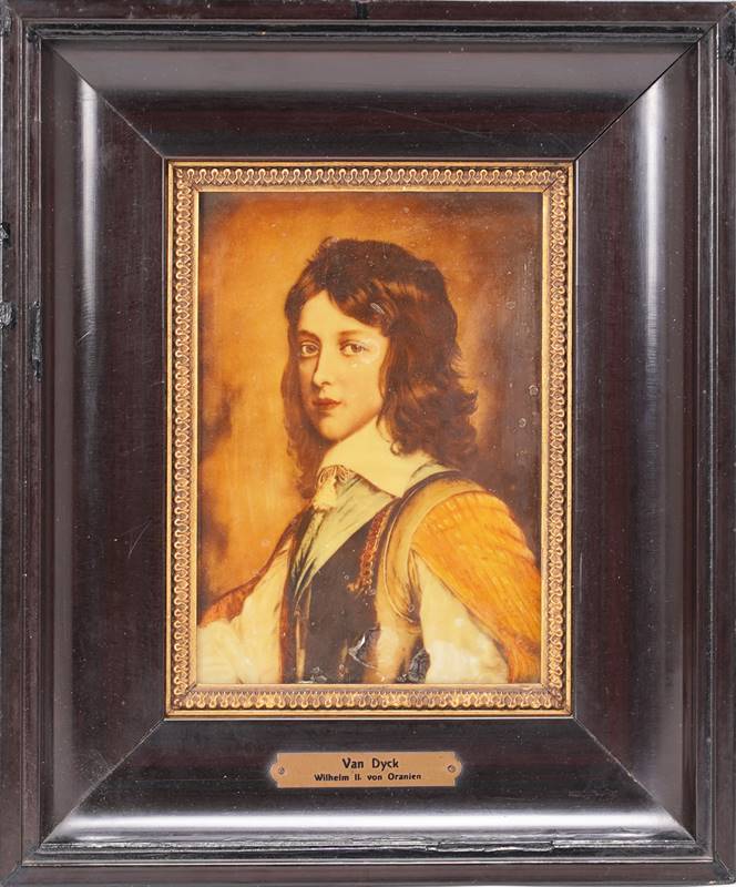 Portrait des Wilhelm II. von Oranien Nach Anthonis van Dyck (1599-1641). Handmalerei auf Keramik. Portrait des jungen Wilhelm II. Unter dem Bild, auf dem Rahmen eine Plakette Van Dyck Wilhelm II. von Oranien. Verso auf dem Rahmen ein Etikett Dresdener Keramische Handmalerei. Ersatz für Porzellanmalerei. Absolut haltbar. Größe Keramikplatte ca. 16,5 x 12 cm, Rahmen ca. 27 x 22 cm. Firnis teils blasenförmig abgeplatzt.