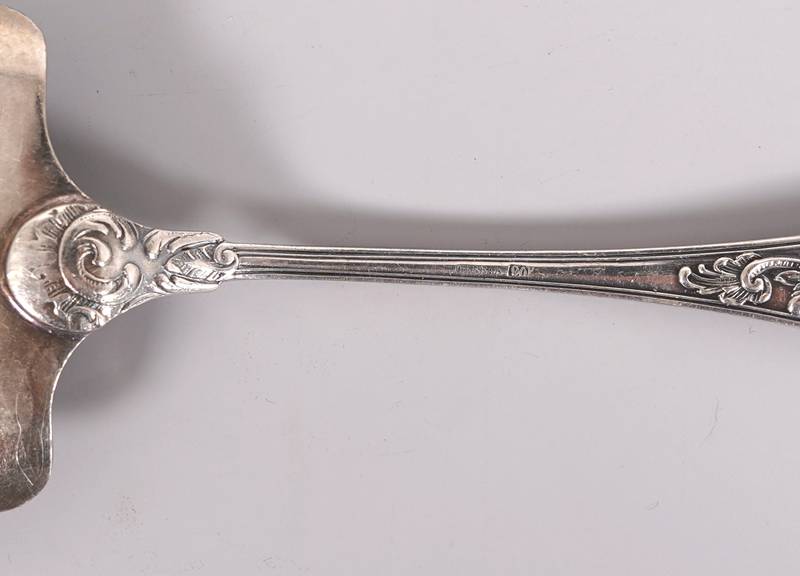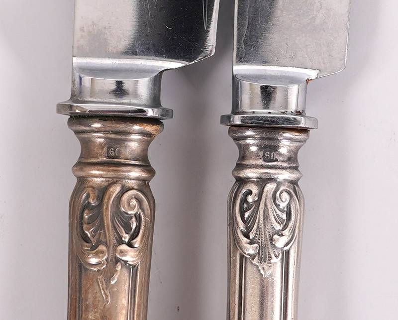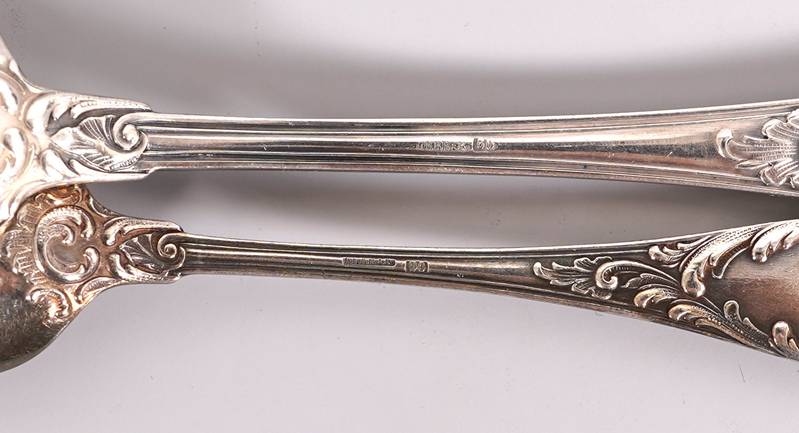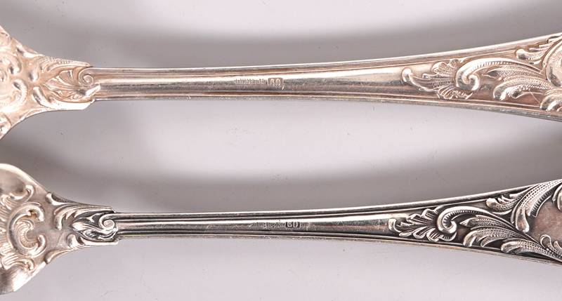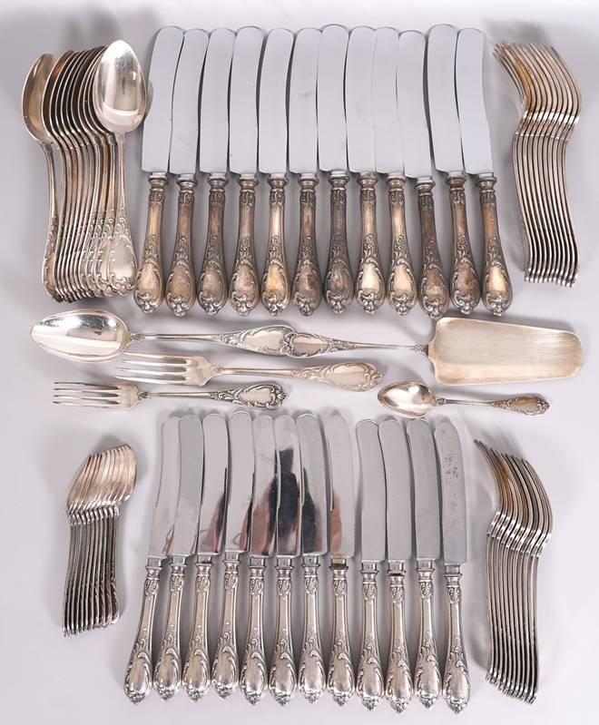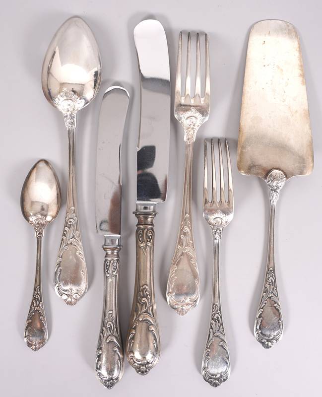 Deutsch 20. Jh. Versilbert. Rokokodekor. Für 12 Personen mit je zwei Größen Messer, Gabeln und Löffel. Dazu einen Tortenheber. Punziert mit Hersteller "Gebr.:K" und Auflage 60/90. Länge der großen Messer ca. 26 cm, Gesamtgewicht ca. 4840 Gramm. Altersbedingte Patina wie abgebildet.