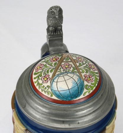 Um 1892. Krug der Naturwissenschaften. Keramikkrug mit polychromem Dekor in Form von Büchern. Zinndeckel mit Eule und Keramik Vignette ebenfalls mit polychromem Dekor. Innen bezeichnet und datiert. Unter dem Boden Manufakturmarke. Guter Zustand.