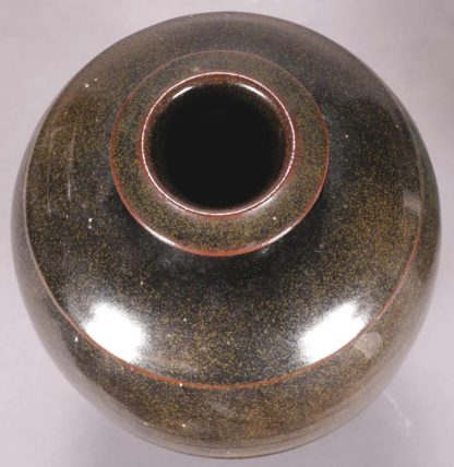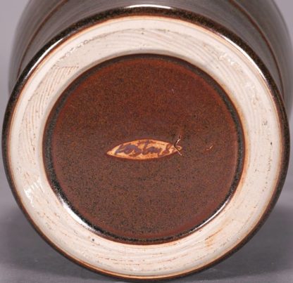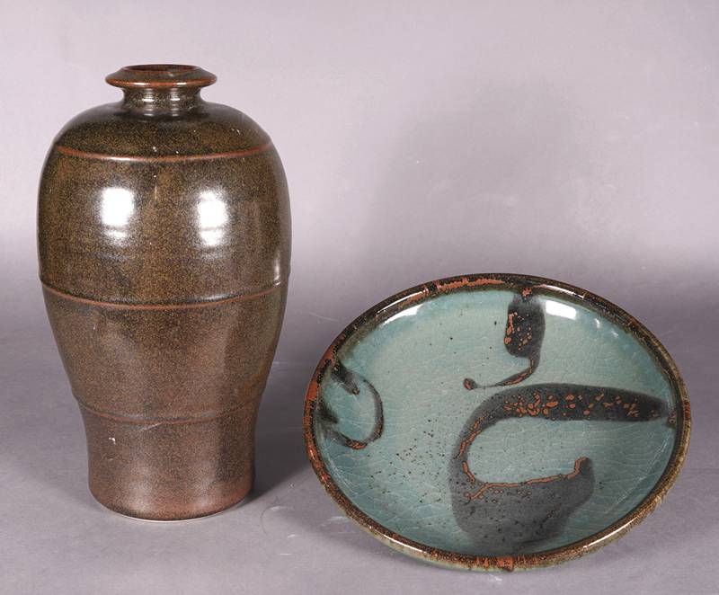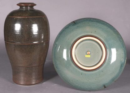 1941 Frankfurt am Main - 2005 Kandern. Zwei Objekte. Eine Vase aus hellem Scherben mit brauner Reduktionsglasur. Bauchiger Korpus mit Ringen, eingezogenem Hals und ausgestellter Mündung. Unter dem Boden mit Signatur und Datierung (19)87. Dazu eine Schale, heller Scherben, mit blauer Craqueléglasur und braunen Schlieren. Unter dem Boden mit Herstellermarke. Durchmesser der Schale ca. 29 cm, Höhe ca. 7 cm.