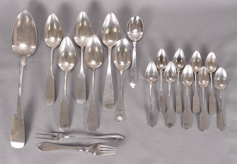 Silber verschiedener Legierungen, teils Tremulierstriche, teils punziert bis 835, teils diverse europäische Punzen, teils nicht punziert aber geprüft. Barock-und Biedermeierbesteckteile wie abgebildet. Länge des großen Saucenlöffels ca. 32 cm, Länge des barocken Tauflöffels aus dem Jahr 1740 ca. 19 cm, Gesamtgewicht ca. 650 Gramm. Unterschiedliche Zustände wie abgebildet.